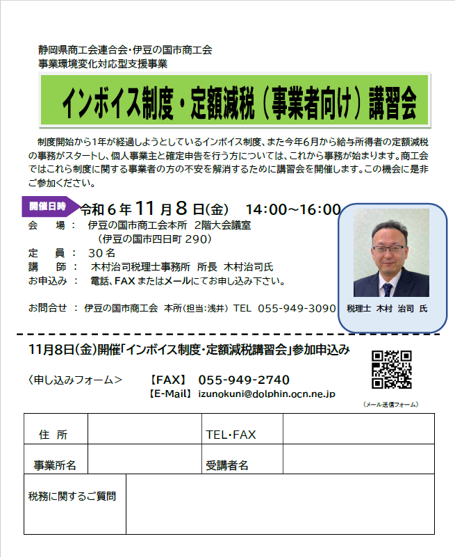 制度開始から1年が経過したインボイス制度、また今年6月から給与所得者の定額減税の事務がスタートし、個人事業主と確定申告を行う方についてはこれから事務が始まります。商工会ではこれら制度に関する事業者の方の不安を解消するために講習会を開催します。この機会に是非ご参加ください。